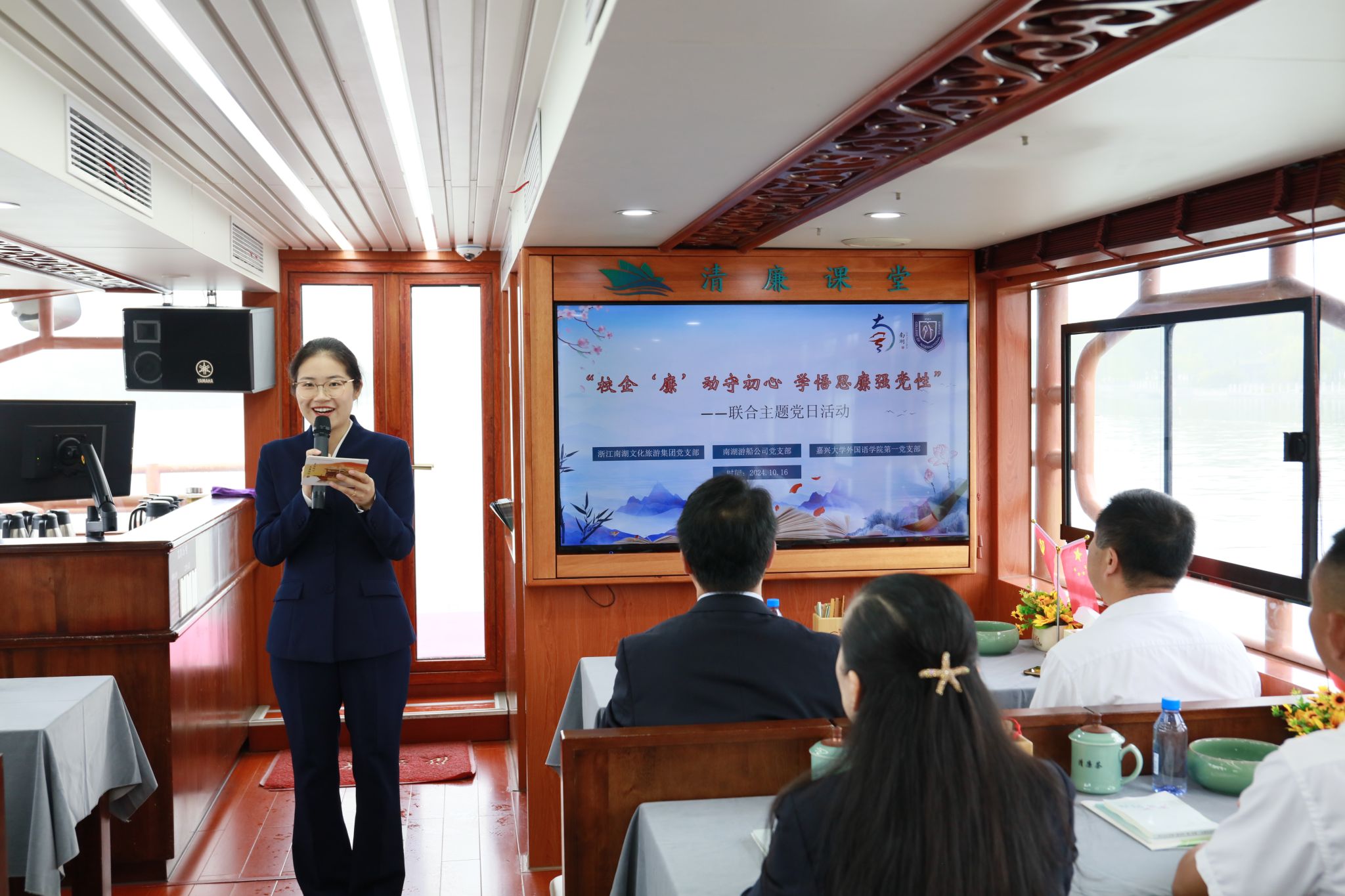 10月16日上午,私房tv 第一党支部联合南湖文旅党支部、游船公司党支部组织开展了以“校企‘廉’动守初心 学悟思廉强党性”为主题的南湖清风行的“水上廉课”联学活动。