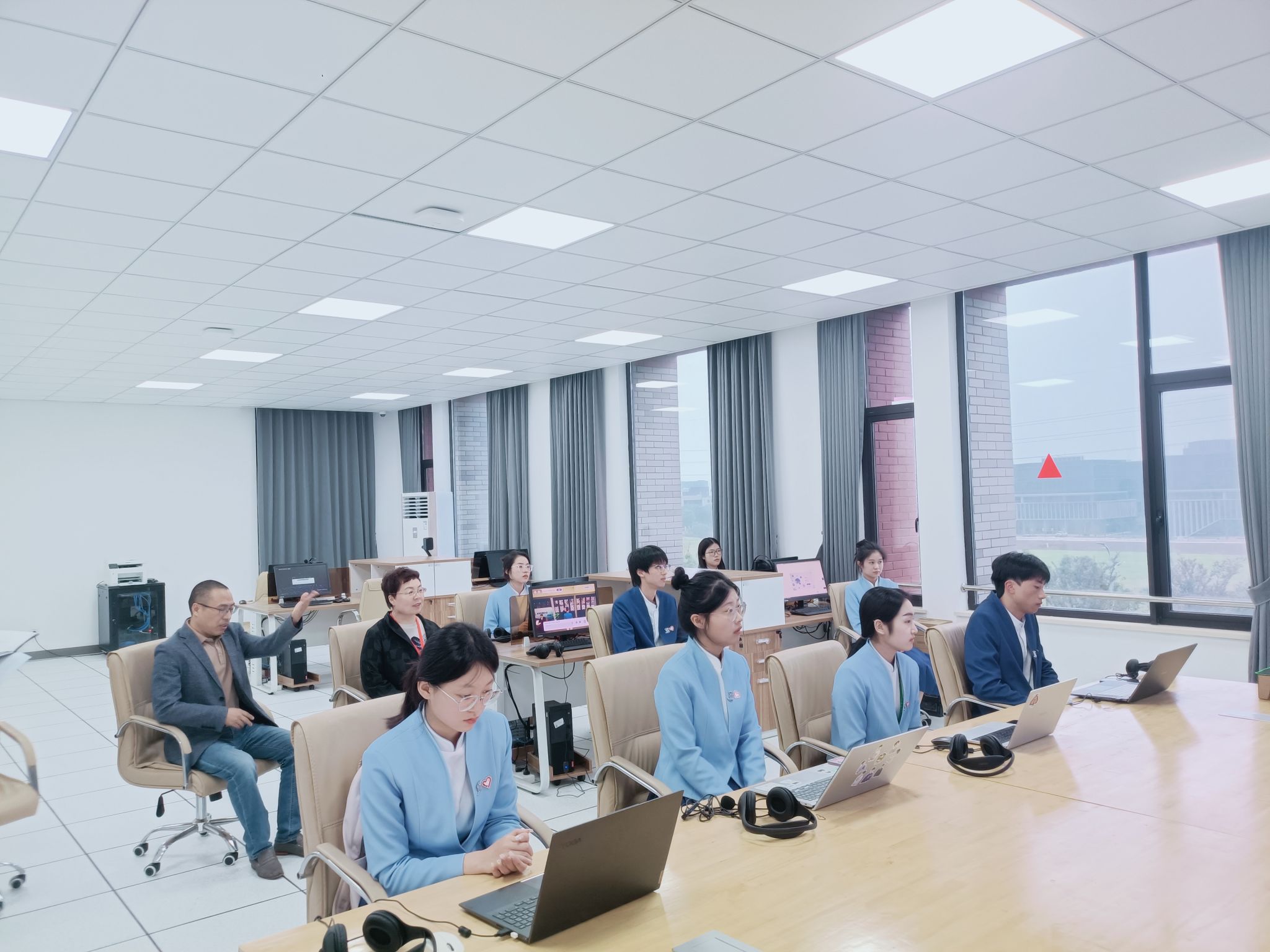 在听取汇报后,岳慧兰对学院在专业建设、实践教学、创新创业教育、教学资源与利用等方面提出了建议,希望学院梳理存在的问题,提出具有学院特色的整改措施。之后,岳慧兰查阅了学院的试卷、毕业论文(设计)、教学活动记录等教学基本文件资料,走访考察了省级重点建设实验教学示范中心,参观了虚拟情境录播室、同声传译实验室、虚拟仿真实验室等实践教学场所,并现场观摩了由师生共同展示的国际会议志愿者虚拟仿真实验项目。
