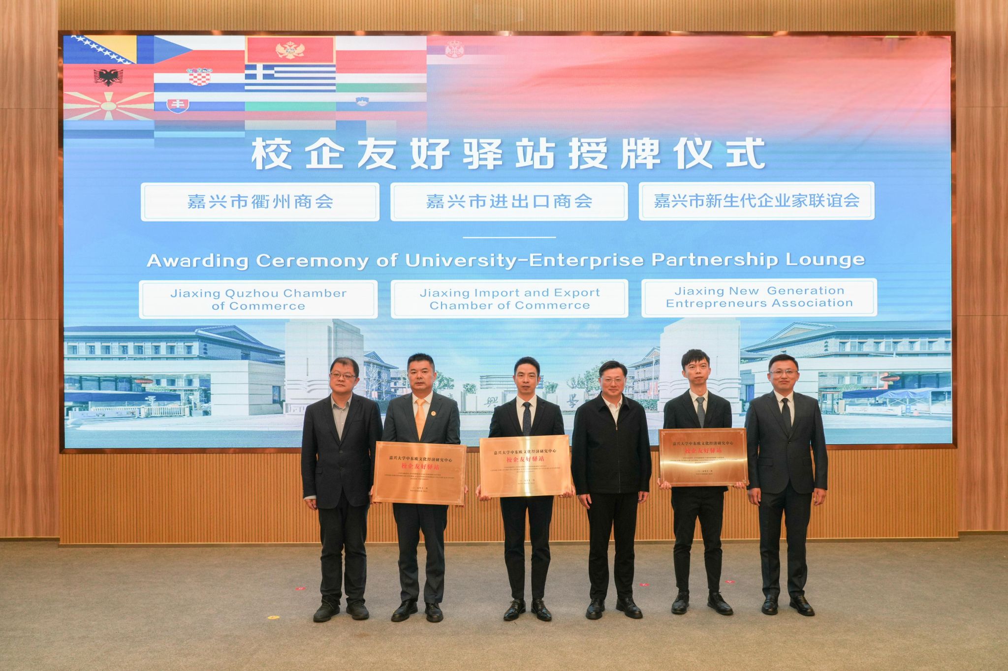 会上,还进行了校企合作签约与友好驿站授牌。私房tv 中东欧文化经济研究中心分别与嘉兴市咨询服务行业协会、嘉兴市光伏行业协会签署合作协议,依托高校智库资源与行业协会渠道优势,打通政策解读、供应链对接等服务壁垒;与嘉兴市进出口商会、嘉兴市新生代企业家联谊会和嘉兴市衢州商会进行校企友好驿站授牌,搭建起实体沟通窗口,未来将定期互通市场动态与产业需求,实现“产学研用”闭环联动,助力企业快速融入中东欧产业链体系。